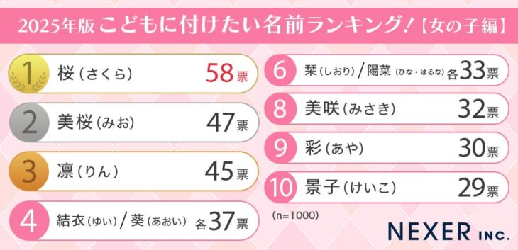 2025年版女の子に付けたい名前ランキングでは、「桜」や「美桜」など自然を連想させる名前が上位を占めた。