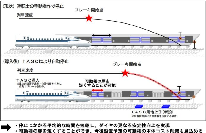 東海旅客鉄道(JR東海)は、東海道新幹線に自動運転システムを将来的に導入する取り組みの一環として、2026年秋から定位置停止制御(TASC:Train Automatic Stop-position Control)の運用を開始することを発表した。TASCは、列車が駅に停車する際に自動でブレーキをかけ、所定の停止位置に高精度で停めるシステムだ。従来は運転士が手動で停車操作を行っていたが、TASCを使うことで停止にかかる平均的な時間を短縮でき、ダイヤの安定性をさらに高められるのようだ。また、停車精度の向上により、駅ホームに設置される可動柵(ホームドア)の扉を短くすることが可能となり、新設や老朽化による取り替え時にコスト削減効果が期待できると言える。新幹線では初の営業列車への導入となり、安全性と効率性を両立する技術革新として注目されているのようだ。