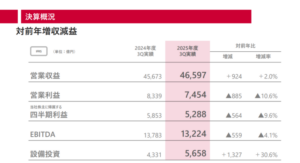 株式会社NTTドコモは2026年2月5日に、2026年3月期第3四半期決算の業績および重点施策を発表した。2025年4月から12月までの営業収益は4兆6,597億円となり、前年同期の4兆5,673億円から924億円増加した一方、営業利益は7,454億円と前年同期比で885億円減少した。当社株主に帰属する四半期利益も5,288億円と564億円減少している。