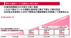 設備投資額は5,658億円と前年同期比で1,327億円増加した。通信品質向上に向けた取り組みとして、5G基地局の構築を加速させており、2025年度下期は上期比で約3倍のペースで整備を進めている。主要都市中心部では下り通信速度100Mbps以上を約90%のエリアで達成したとし、2026年度もこの構築ペースを維持する方針だ。東京メトロ各路線への5G導入も進め、2026年4月をめどに地下駅の60%以上で5Gを導入し、設備容量を1.5倍以上へ拡大する計画を示している