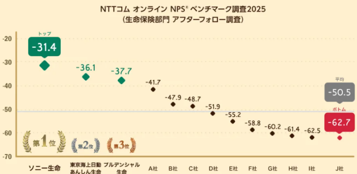 NTTコム オンライン・マーケティング・ソリューション株式会社は、NPSベンチマーク調査2025生命保険部門アフターフォロー調査を実施した。本調査は訪問や面談、連絡、情報提供といった、生命保険の契約後における一連のアフターフォロー体験に焦点をあてた調査である。その結果、最もNPSが高かったのは4年連続でソニー生命保険(以下、ソニー生命)だった。