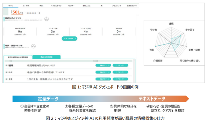 「マジ神AI」は、高い専門性をもつ介護職員、通称“マジ神”が持つノウハウをAIに落とし込み、経験の浅い職員でも質の高い介護を実践できるよう支援するシステムだ。AIは日々蓄積されるご入居者の情報を分析し、状態変化の兆しや心理的なサインを可視化するダッシュボードを提供しており、このシステムを導入した施設では、職員の情報収集の傾向にも変化が見られたという。AIを活用している職員は、テキストよりも定量データに注目しやすく、先に数値的なデータを確認してから記録の文章に目を通す傾向が強いとされている。これは、専門性の高い“マジ神”たちと同様の情報収集スタイルであり、AIの利用がプロフェッショナルと同等の判断力を育む可能性を示している。