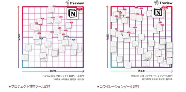 Notion Labs Japan合同会社は、アイティクラウド株式会社が主催する「ITreview Grid Award 2025 Fall」において、コラボレーションソフトウェア「Notion」が「コラボレーションツール」「プロジェクト管理ツール」「タスク管理ツール/ToDo管理」「業務可視化ツール」「AIライティングツール」「文章生成AI」「AI議事録自動作成ツール」の計7部門で「Leader」を受賞したと発表した。特に「AI議事録自動作成ツール」部門では初めての受賞となり、「コラボレーションツール」部門では18期連続の受賞を達成した。さらに、同アワード内のカテゴリーレポートでは「コラボレーションツール」「プロジェクト管理ツール」「タスク管理ツール/ToDo管理」の3部門で顧客満足度No.1を獲得したことも明らかにされた。