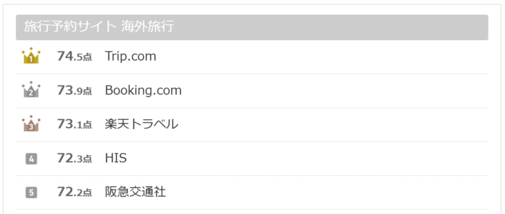海外旅行予約サイトに目を向けると、「Trip.com(トリップ・ドットコム)」が初めての総合1位に選出された。このプラットフォームは「問い合わせのしやすさ」や「コストパフォーマンス」を含む5項目で1位となったほか、航空券とホテルを組み合わせた予約や、スマートフォンアプリの利用においても高い満足度を示している。2位には「Booking.com(ブッキング・ドットコム)」、3位には「楽天トラベル」が続き、大手オンライン旅行代理店(OTA)が上位を占める結果となった。また、実店舗を持つ旅行会社も健闘しており、HISが4位、阪急交通社が5位と、それぞれ前回から順位を維持または向上させている。