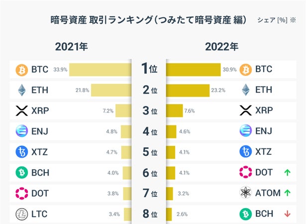 前年2021年のランキングと比較すると上位銘柄に大きな変化はないものの、国内ではGMOコインが唯一取り扱っているコスモス(ATOM)(※2)のシェアが拡大し、7位にランクインした。また2022年は新たに6銘柄の取り扱いを開始し、500円から積み立てることができる「つみたて暗号資産」の銘柄数は20となった(※3)。
