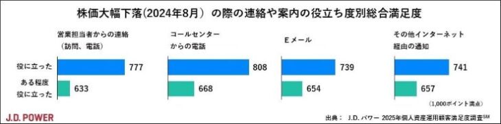 また、2024年8月の東京株式市場の株価大幅下落時において、金融機関からの市場状況や今後の見通しに関する連絡や案内の有無が顧客満足度に大きな差異をもたらすことが確認された。特に、提供される情報が「役に立つ」と感じられるかどうかが重要であり、「ある程度役に立った」情報と比較して「役に立った」情報の場合、オンライン経由で80ポイント以上、人を介した連絡では140ポイント以上も満足度に差が出た。顧客が必要としている情報を見極め、効果的なチャネルを通じて提供することが、顧客の不安を軽減し、ひいては金融機関に対する信頼と満足度を高める鍵である。