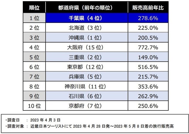 国内人気旅行先ランキングでは、「東京ディズニーリゾート」への観光客が多い千葉県が1位を獲得したほか、大自然、温泉、グルメなどの魅力が満載の北海道が2位にランクインし、GW定番の人気スポットの沖縄県が3位にランクイン。そして、4位には「ユニバーサル・スタジオ・ジャパン」への観光客が多い大阪府となった。