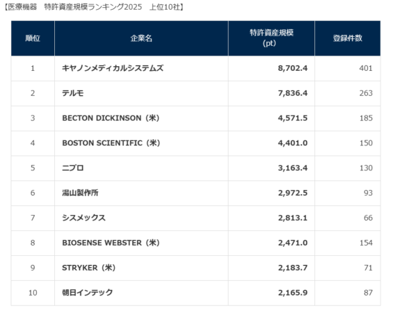パテント・リザルトは2025年10月、医療機器業界における特許資産を総合評価した「特許資産規模ランキング2025」を発表した。対象期間は2023年4月1日~2025年3月末で、この期間に登録された特許を独自指標「パテントスコア」で評価し、特許の質と量を総合的に算出したものだ。ランキングでは、1位がキヤノンメディカルシステムズ、2位がテルモ、3位が米BECTON DICKINSON となった。続く上位には4位に米Boston Scientific、5位にニプロが入った。