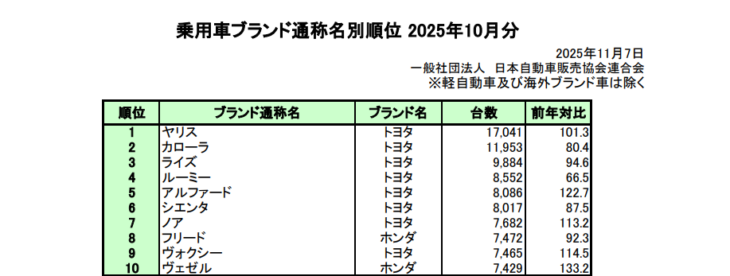 株式会社日本自動車販売協会連合会は2025年11月6日に2025年10月の乗用車ブランド通称名別新車販売台数ランキングを発表した。日本自動車販売協会連合会が公表した2025年10月の新車販売台数ランキングは、前月に引き続きトヨタ車が上位を独占し、特にミニバン勢が大きく順位を上げたことが特徴だ。1位から4位までは変動がなかったものの、高級ミニバンの「アルファード」と「ヴェルファイア」が揃って急上昇するなど、ランキング全体で大きな動きが見られた。